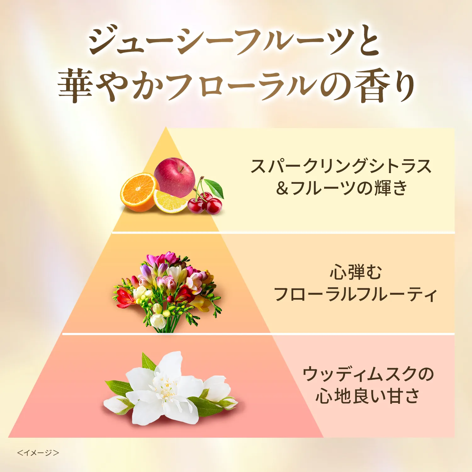 ダメージリペア・モイスチャー・ストレートビューティシリーズはトップがスパークリングシトラス&フルーツ、ミドルが心弾むフローラルフル-ティ、ボトムがウッディムスクの心地よい甘さを楽しめます。