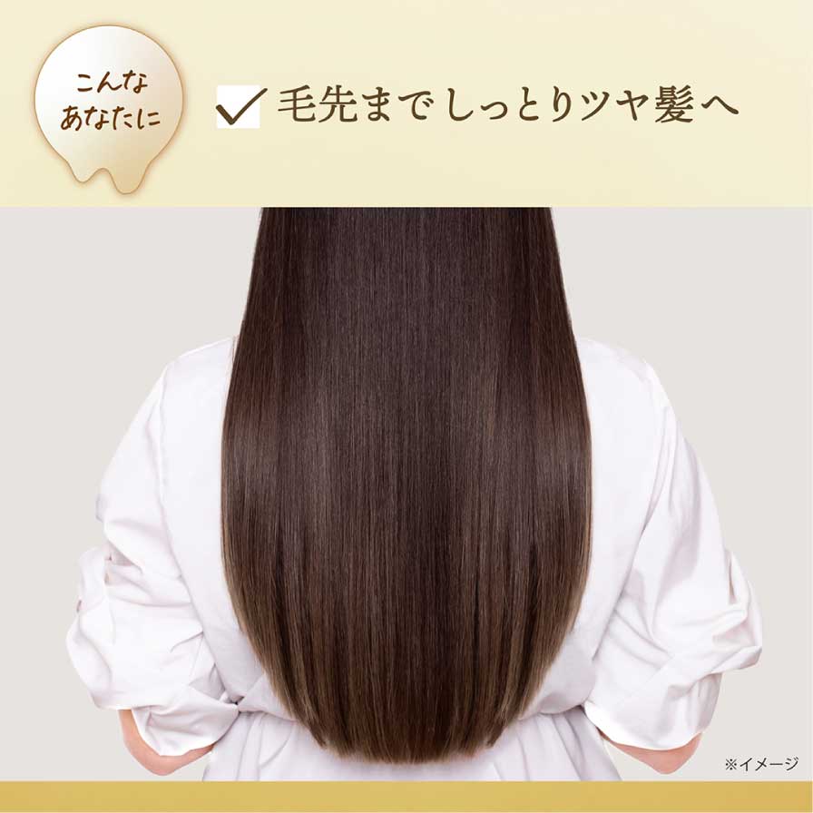 パサつきや乾燥をうるおいで内側まで濃密に保湿。とろとろテクスチャーのトリートメントが高密着。髪の上ですーっと伸びて浸透保湿。保湿成分が長くとどまり、毛先までしっとりうるツヤ髪へ。濃厚保湿成分*配合。